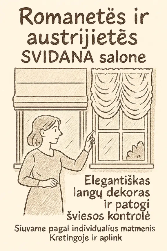 Romanetės ir austrijietės Svidana salone – elegantiškas langų dekoras ir patogi šviesos kontrolė. Romanetės – tvarkingas, lygus kritimas; austrijietės (austrijietės užuolaidos) – dekoratyvios, pūstos klostės. Siuvame pagal individualius matmenis, parenkame audinius ir mechanizmus. Konsultuojame, matuojame, siuvame, montuojame Kretingoje ir aplink.