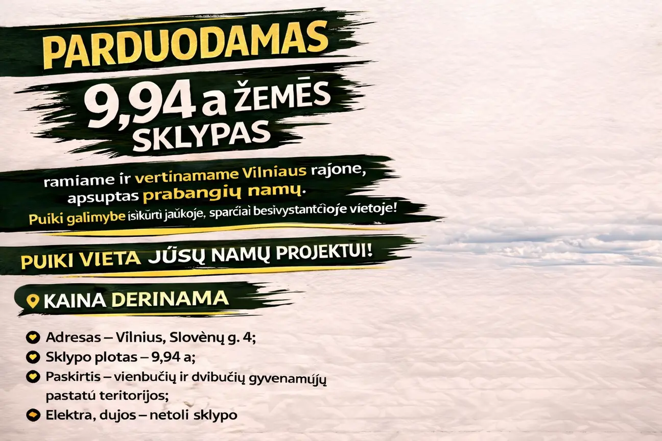 Parduodamas 9,94 a žemės sklypas ramiame ir vertinamame Vilniaus rajone, apsuptas prabangių namų. Puiki galimybė įsikurti jaukioje, sparčiai besivystančioje vietoje!