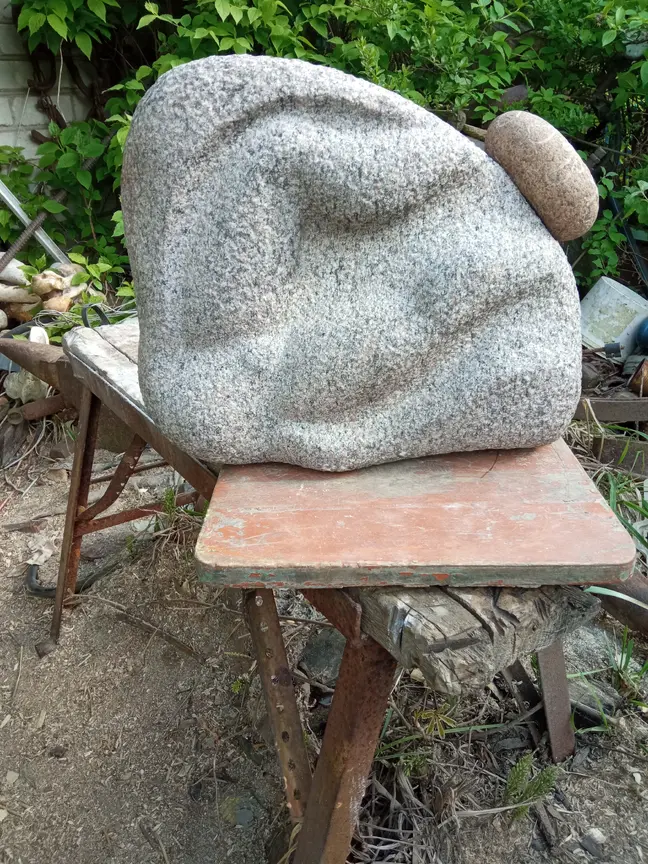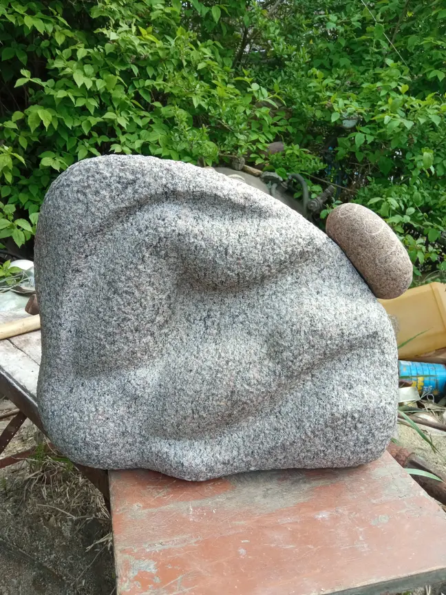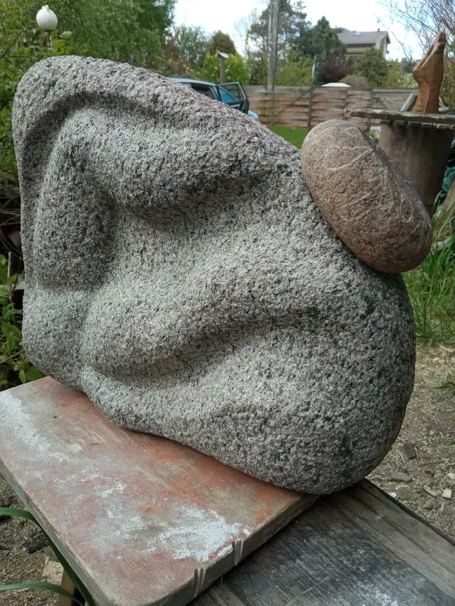 Granito skulptūra: 40x30 cm., storis 15 cm. Bučarduotas, grubokas paviršius, plastiškos formos. Gali neribotą laiką stovėti lauke. Kaina: 250 eurų.