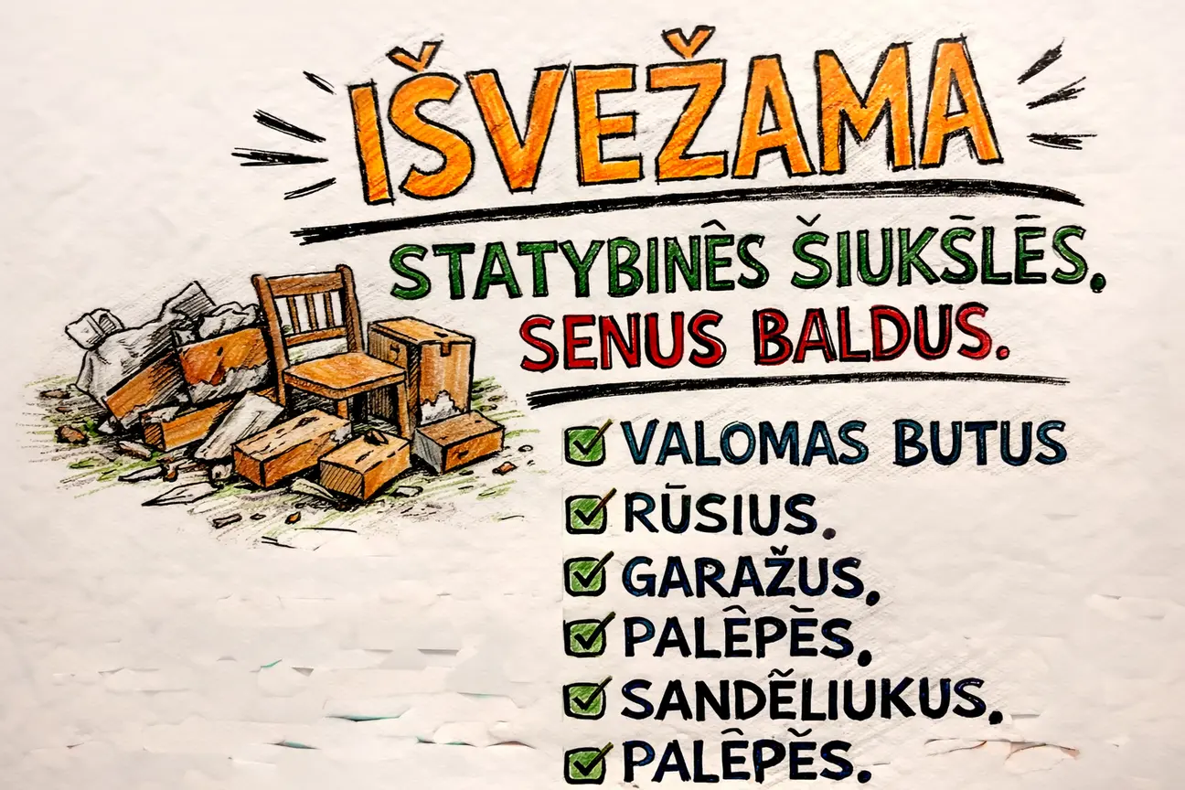 Išvežame statybines šiukšles ir senus baldus. Valome butus, rūsius, garažus, palėpes ir sandėliukus.